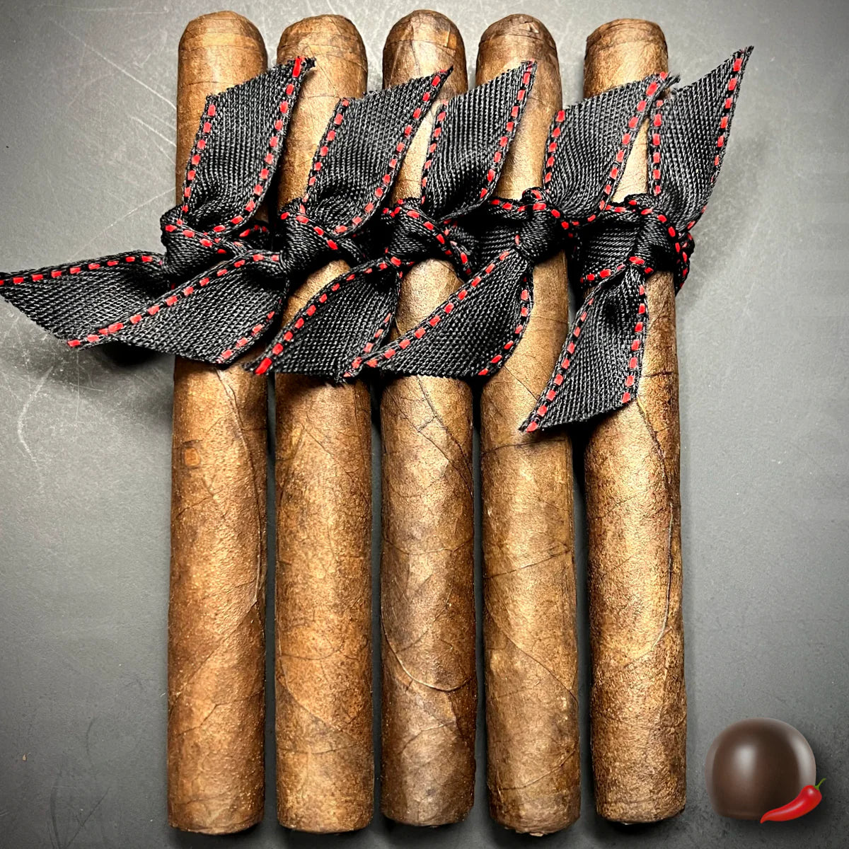 CHOCOLATE CHILI TRUFFLES is a 6x46 skinny Toro. Wrapper is an oily and extremely chocolatey San Andres Maduro leaf. Fillers (as always) for Ezra Blends, are undisclosed.