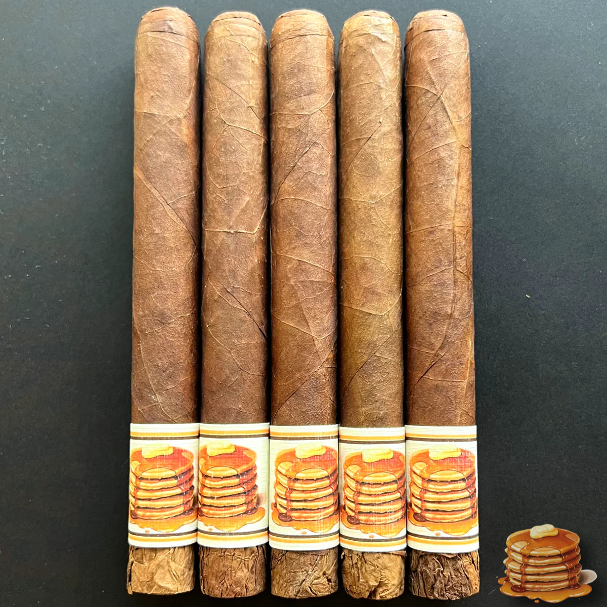 PANCAKES & SYRUP is a unique and special cigar blend created by Ezra Zion, rooted in the nostalgic memories of the creator's childhood. The blend draws inspiration from the simple joy of waking up to a comforting breakfast of pancakes, butter, and maple syrup. This project has been a labor of love, taking over four years to perfect, with a focus on achieving the perfect balance of flavors reminiscent of a delicious pancake breakfast.