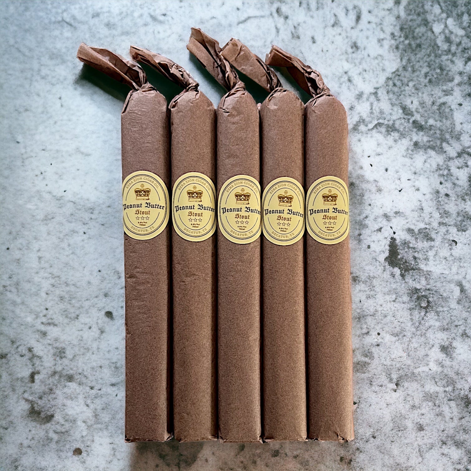 PEANUT BUTTER STOUT is a full-bodied, med/full-strength 6x52 box-pressed toro. Wrapper is an oily 9-year-aged Sumatra Maduro leaf. Fillers are undisclosed but they are all between 6-12 years aged!