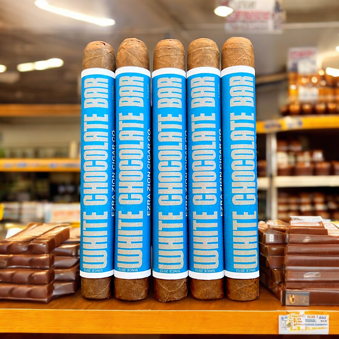 The WHITE CHOCOLATE BAR ‘24 by Ezra Zion is a highly unique, full-bodied cigar with medium strength, featuring a 6x52 Toro size. It’s crafted from 7-13 year-aged tobaccos, including an 11-year-aged Criollo 98 wrapper. This cigar offers a luxurious and complex flavor profile reminiscent of a chocolate bar, with notes of white chocolate, hot cocoa, heavy cream, caramel, and buttercream, evolving into hints of leather, amaretto, and bourbon as it progresses. With only 590 cigars produced, it's expected to sell out quickly, making it a rare and coveted release for cigar enthusiasts.